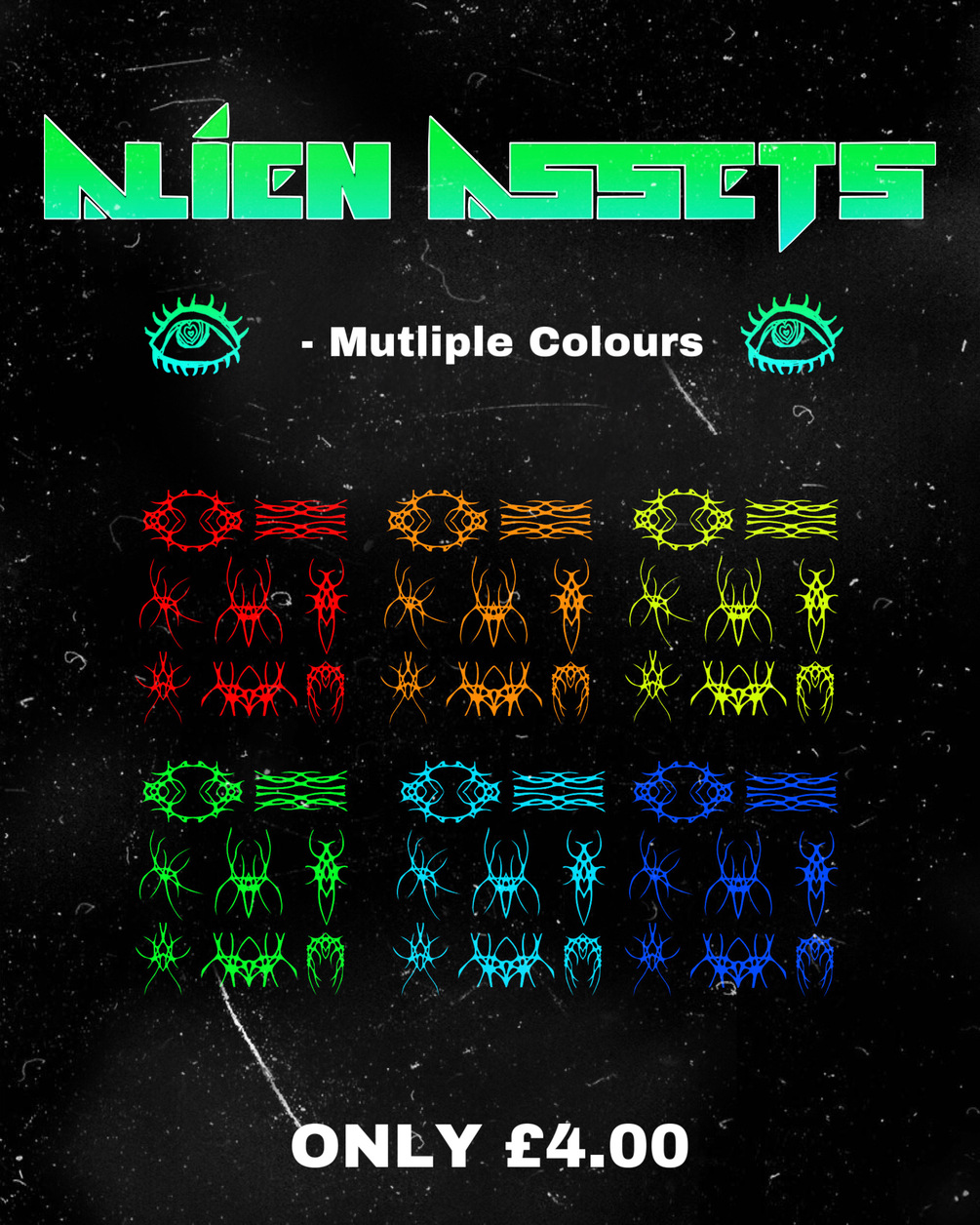 I have created some graphic assets in a cool “ALIEN” style. They’re all pre-coloured, and I’ve even added some gradient assets too!!